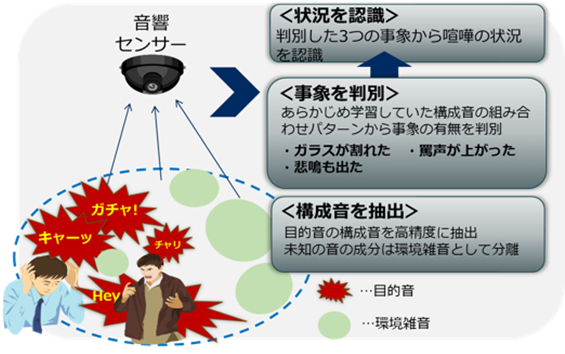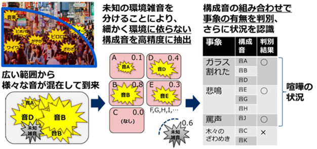 昨今、安全・安心に向けた取り組みとして、カメラ映像だけでは見えにくい場所でも、音により起きている状況を認識できる技術の開発が進められています。 従来の技術は、個々の環境で目的音を大量に学習することで検知を行っていました。しかし、広い範囲から目的音を検知する際、多くの環境雑音が混入するため、遠くで発生した小さな目的音の検知感度が低下したり、目的音を個々の環境ごとに学習させる必要があるなど、未知の環境への導入が難しいといった課題がありました。 今回開発した「音状況認識技術」は、マイクで収集した音から未知の環境雑音を分けて環境によらない構成音を高感度に検知し、構成音の組み合わせパターンから事象の有無を高精度に判別することで、これらの課題を解決する技術です。