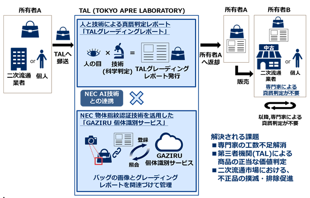 「TALグレーディングレポート発行サービス」は、アプレによる高級ブランド品の真贋判定結果をグレーディングレポート(注4)として発行し、NECの「GAZIRU個体識別サービス」により現品の画像と関連づけて管理することで、すり替わりを防止できる信頼性の高いレポートの提供を実現しています。