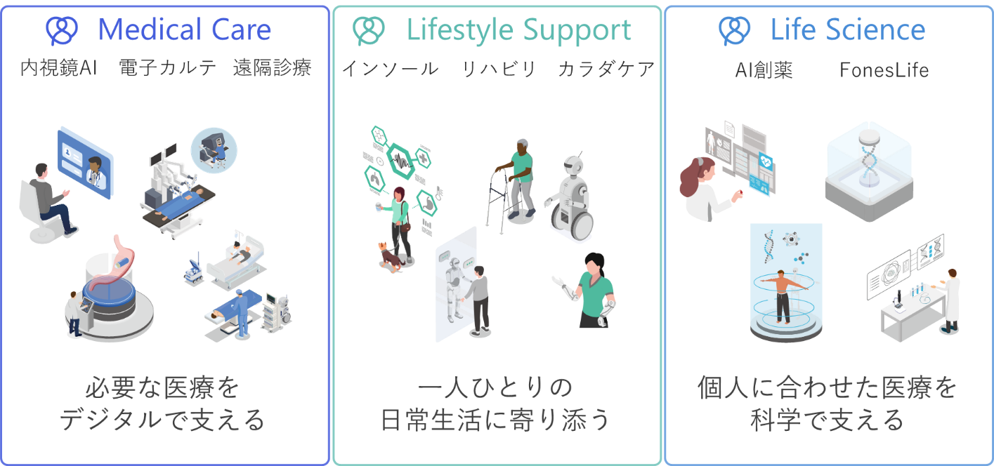 1つ目が必要な医療をデジタルで支える「Medical Care事業」、2つ目が一人ひとりの日常生活に寄り添う「Lifestyle Support事業」、そして3つ目が個人に合わせた医療を技術で支える「Life Science事業」です。これら3つの領域での事業を通じ「live as you あなたを知り、あなたらしく選ぶ」世界の実現を目指します。
