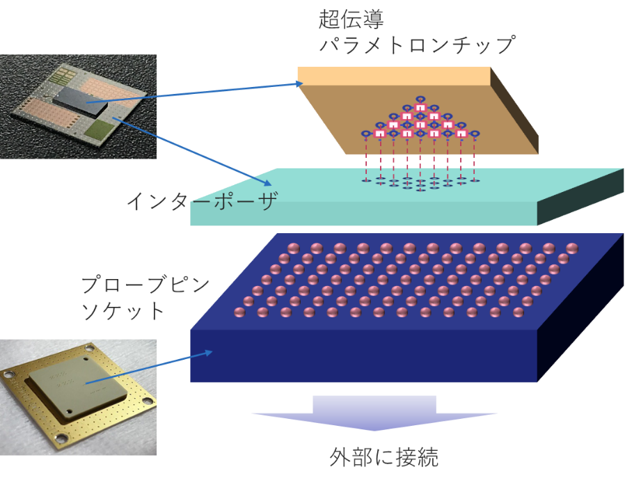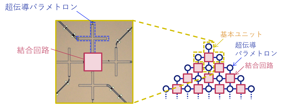 (注2)超伝導パラメトロン:ジョセフソン素子とキャパシタで構成される超伝導共振回路。回路を共振周波数の約2倍の周波数で変調することにより、0またはπの位相で発振する。これらの位相の異なる発振状態の重ね合わせを量子ビットとして使用することができる。磁束量子ビットと比較して量子ビットの寿命(高速演算が可能な時間の上限を決める)が桁違いに長いため、一定時間内における計算精度の向上が見込める。
