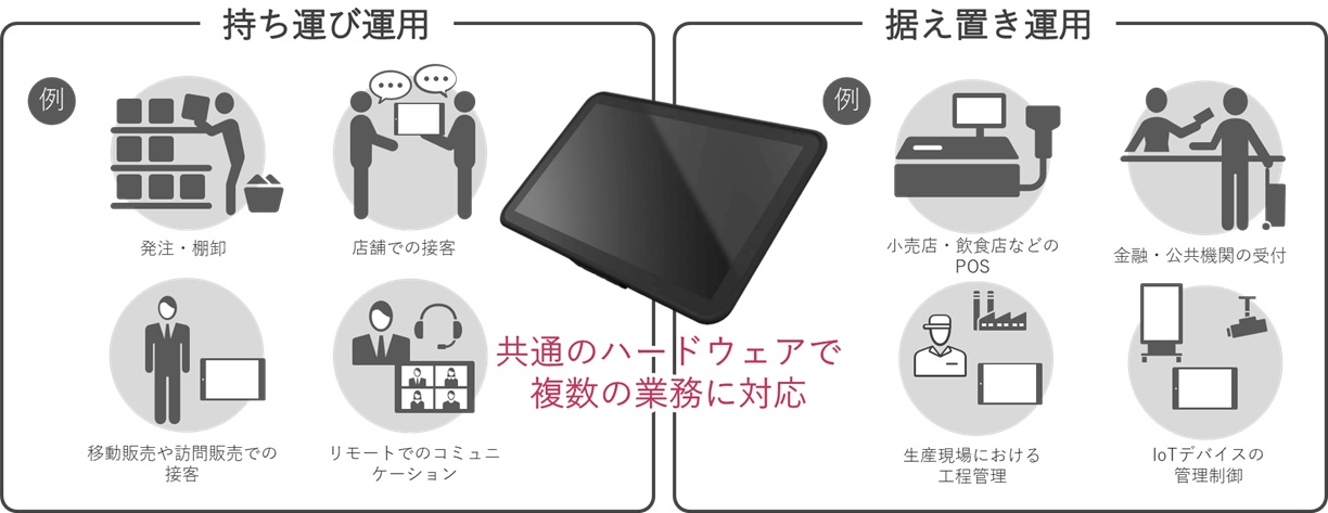 新製品は、専用のクレードルやドッキングステーションを介して各種周辺機器やIoTデバイスと連携でき、IP54(注1)相当の防塵・防滴性能、耐落下強度1m(注2)、抗菌・抗ウイルス仕様(注3)など業務用端末として求められる堅牢性・耐環境性を備えた、様々な業種の現場におけるDX化を支援する業務用タブレット端末です。例えば、工場・倉庫での工程管理や作業指示、小売店舗における発注・棚卸しや勤怠管理などのバックオフィス業務、店頭での接客支援や前捌き、金融・公共・ホテルの受付や業務指示など、幅広いシーンでの活用が可能です。外観は、人目に触れる場所への設置や接客用途を意識したスタイリッシュなデザインを取り入れました。また、USB Power Deliveryの採用により、モバイルバッテリからの電源供給も可能であり、電源環境の整っていないイベント会場や屋外での運用をはじめ、災害時などのBCP対策にも有効です。