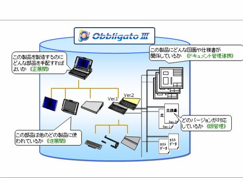 Obbligato III では、EXCELライクでBOMを編集できる機能(構成コピー、ドラッグ&ドロップ編集など)や、差分の一括変換、 代替部品、設計変更時の構成差分のハイライト表示、構成の一括置換などの、きめ細かい便利機能を多数装備しており、 BOMにこだわりのある日本の設計者の方からも高い評価を得ています。