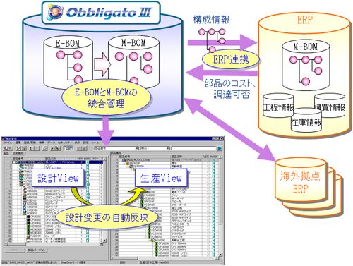 BOMなどの設計情報は、実際の生産を管理するERPシステムに適切なタイミングと形式で確実に 引き渡される必要があります。また、工場や拠点によって異なるERPシステムを利用している場合、 マスタとしての設計情報とERPごとに異なる設計情報を矛盾なく統合して管理しなくてはなりません。 Obbligato III は、統合BOMとERPシステムとの間で部品/部品表情報、実績情報等の双方向の連携を 行うことにより、シームレスな設計-生産連携を実現します。