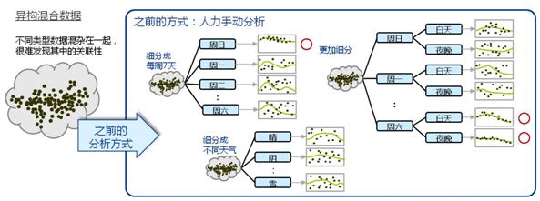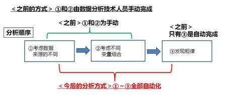 以往“依条件筛选数据”与“多项变量的组合”,都必须依靠具备专业知识的分析人员手动操作。例如,在进行零售业的销售预测时,统计分析不同门店的销售趋势后,以一星期7天、不同天气等条件为分析基础,都必须由分析人员反复依靠条件筛选数据。此外,对于某一商品而言,重要的变量分析组合,可能为不同种类的商品销售带来哪些影响,在调查此类情形时,分析人员也必须事先针对各项商品提出假设,而后进行评价。
