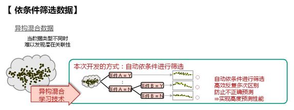 “异构混合学习技术”能够发现混合存在于大数据中的多个关联性,同时将所发现的关联性分解为多个简单式,并针对分析目标,组合相关变量后进行分析,实现高度预测与判断。