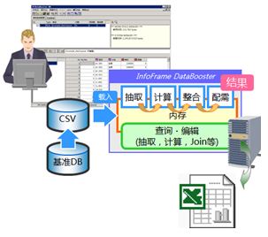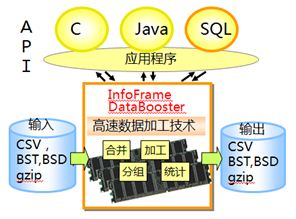 ・Inforame DataBooster提供标准的C语言和Java语言的API接口以及SQL接口,通过C语言或者Java语言,把排序、统计、查询、结合、计算等操作写成批处理程序,实现自动化处理。