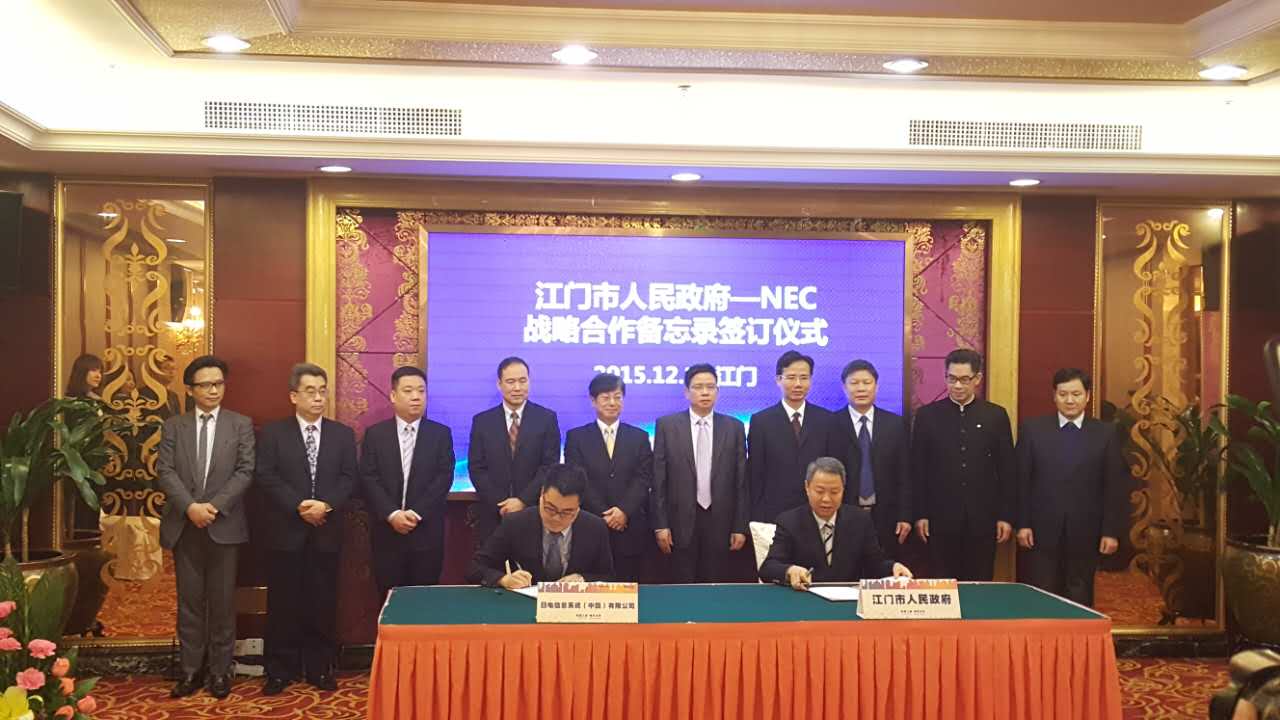 2015年12月15日,江门市人民政府与日电信息系统(中国)有限公司签订建设智慧城市战略合作备忘录,NEC公司同时举办了“互联网+ 江门智慧城市解决方案展示会”。据介绍,根据这个备忘录,江门市与NEC公司将深入研究智慧城市解决方案,内容涵盖“公共安全、创业创新、智慧医疗、智慧养老、智慧能源、智慧交通、智慧物流、工业设计、智慧农业、智慧金融、智慧政务、智慧旅游、云POS服务”等领域。
