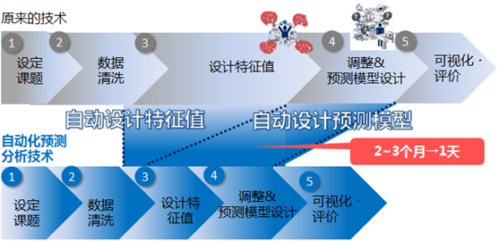 因此,不需要依赖于分析经验及相关知识的假设和计划,也不需要操作数据生成特征值的大量作业,从而大幅缩短分析时间和节省分析人力。此外,机器作业远远超越人工的速度,可以在短时内搜索大量假设,所以有分析结果精准化、能够发现人注意不到的新知识等优势。