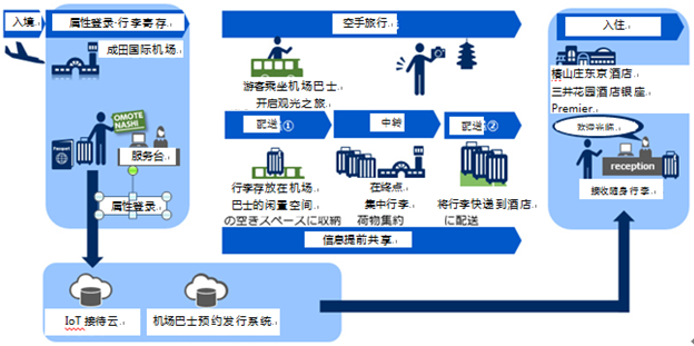 在验证实验中,访日游客在机场寄存行李后开始“空手旅行”时,自行将个人数据登记到“IoT接待云”上便可轻装上阵,即刻开启一段轻松愉快的旅程。通过在机场巴士验票时将游客登记到“IoT接待云”上的信息共享给下榻的酒店,并选择适当的配送时间,大大缩减了酒店接待游客入住的准备和管理时间,给游客和企业双方都带来了极大的便利。
