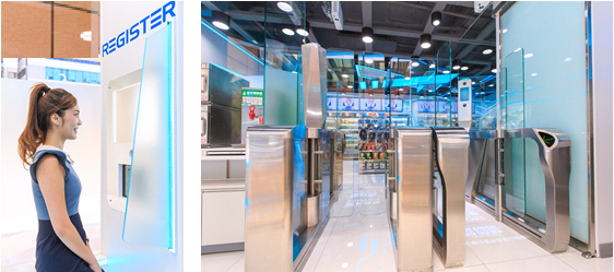 消费者进出店铺与结账时,就会应用到NEC人脸识别系统。在入口旁设置的“太空舱”为消费者资料登录区,其中结合台湾7-ELEVEN现有的OPENPOINT会员机制,结合人脸识别技术,开创全新消费体验。进出口处的闸门区架设了面部生物特征识别设备,一旦身份被确认,屏幕上即出现个人化招呼语,随即便可进入,而智能机器人亦以客制化的用语打招呼,如同朋友般亲切。从入店、结账到离店,全程透过人脸识别Face in、Face pay、Face go,打造创新消费购物体验。