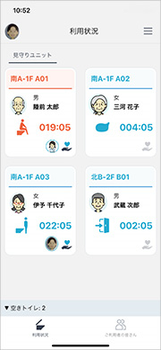 使用边缘智能和物联网技术自动检测排泄情况,并向工作人员手机的应用程序推送提前关联的被护理者信息及其排尿/排便时间、如厕时长、排便量、大便性状、排尿时长等排泄信息。该系统还可以监测到诸如长时间如厕之类需要注意的行为并进行通知,便于护理人员远程观察情况,促进被护理者的独立排泄,护理人员仅在必要的情况下赶过去即可,因此能够最大限度地减少护理人员陪同如厕的工作量。该系统不仅不需要工作人员手写排泄记录,今后还计划与护理记录软件合作,创建高效的排泄日志。