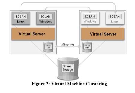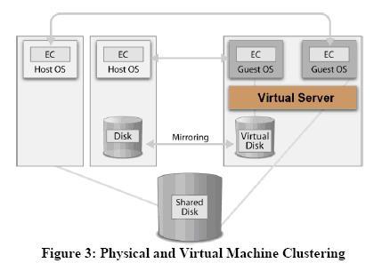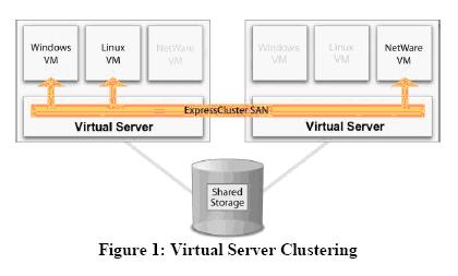 虚拟服务器的集群化(如图1所示)可以通过在拥有共享外挂磁盘的运行在独立物理主机上的两个虚拟服务器间架构一个单一的高可用集群来实现。ExpressCluster同时监控和保护每个运行在虚拟服务器上的独立的虚拟机以及虚拟服务器本身。一旦一个虚拟服务器或者虚拟机失效了,ExpressCluster就会自动将失效的虚拟服务器或者虚拟机切换到备份机器上。