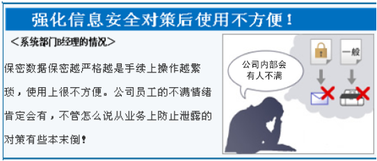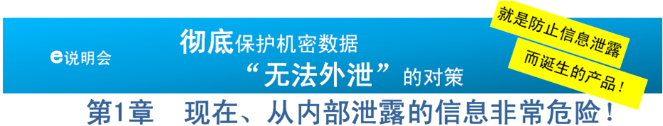 近日连日报道信息泄露事故。发生事故的企业损害在成本方面和设计方面的损害非常严重,因此每日提心吊胆的公司经营管理层和信息安全负责人不断的增加。事实上,信息泄露的原因并不是外界原因,往往是从内部相关人员的盗取或操作失败等内部原因造成的。有人认为“信息只是限制在我们公司内部的”这种说法是行不通的。现在必须马上制定机制防止机密数据流出公司外部。