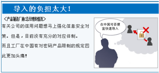 包括中国,有些国家对密码产品的使用规范是有定义的。在这些国家里如果企业使用密码产品,在第1年以及每3年1次要申请复杂的使用申请手续,手续需要花费很多时间和精力对应。