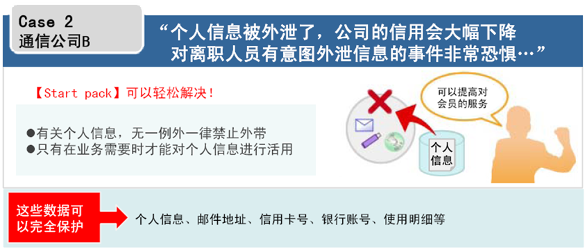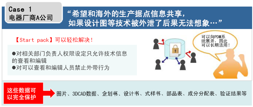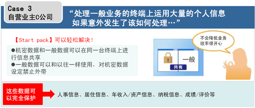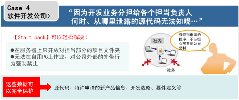 ◆各种场合都可以使用“Start pack”如果使用“Start pack”在信息共享的同时彻底预防信息外泄的风险。让我们看看,有什么样的导入模式和活用场景?通过几个案件,了解“Start pack”的实力。 ◆保护所有企业在任何场合的机密数据!NEC的“Start pack”不问业务形态,对所有机密数据彻底防御。